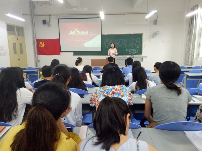 第一学生党支部的陈静同志作为本次大会的主讲人,她以高考语文作文题和重回高考为切入点,详细的为我们阐述了决胜全面建成小康社会、开启全面建设社会主义现代化国家新征程的重要意义。以及作为新时代大学生的我们,也应立足于学生本职的基础上,为全面建设小康社会增强创新活力、奠定文化基础,为实现全面小康贡献出自己的一份力量。