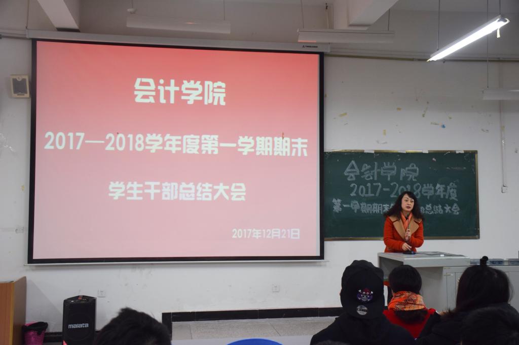 12月21日16:00,我院在主教学楼C114举行了2017-2018学年第一学期期末学生干部总结大会。我院党总支书记韩雪、分团委书记孔岩、财务会计协会指导老师陈琴、记者团指导老师李会、学生公寓自我管理委员会会计学院分会指导老师宋亮波、校友会指导老师张须鹏和全体学生干部参加了本次总结大会。本次会议的召开意在让我院各组织与部门对本学期学生工作进行总结以及对下学期工作进行规划。