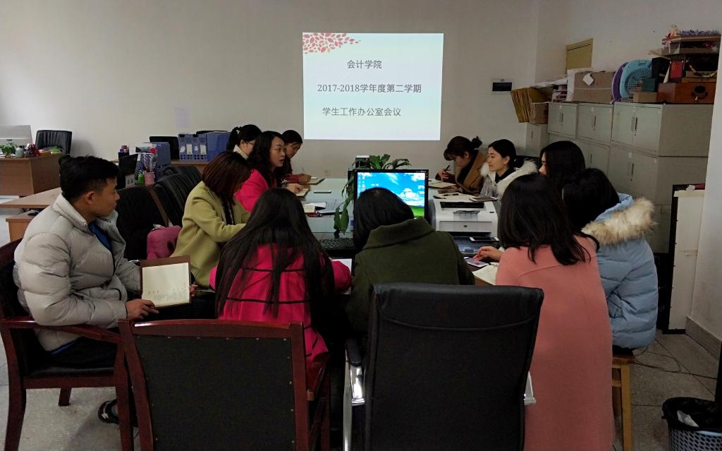 3月5日14:00,会计学院在行政楼A219办公室召开了2017-2018学年第二学期学生工作部署会。我院党总支书记、学生工作办公室主任韩雪及全体辅导员参加了会议。